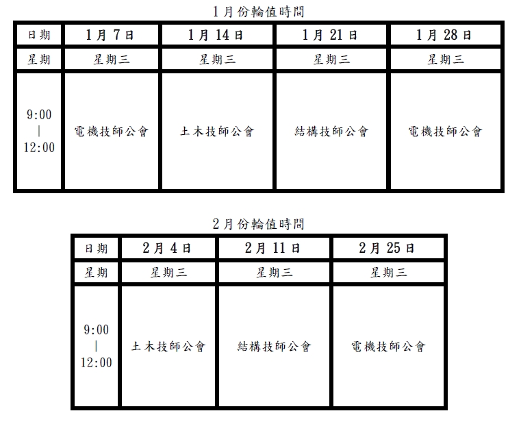 每週二上午9時至12時 |
